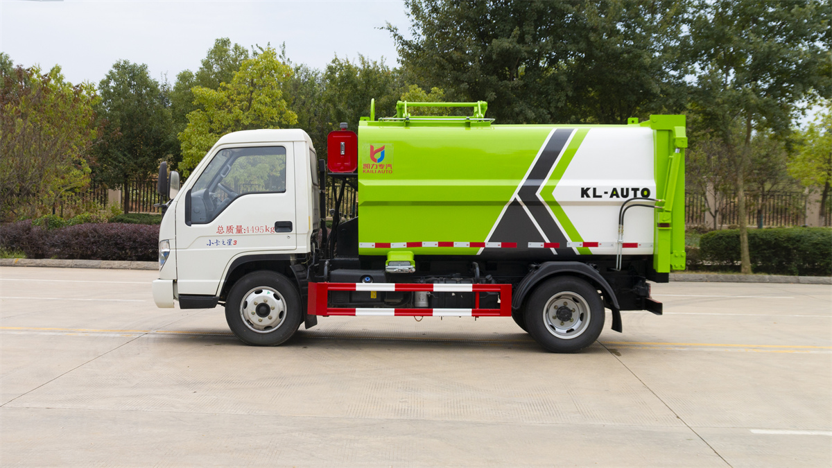 5方掛桶垃圾車-福田小卡3藍(lán)牌側(cè)裝壓縮掛桶垃圾車廠家