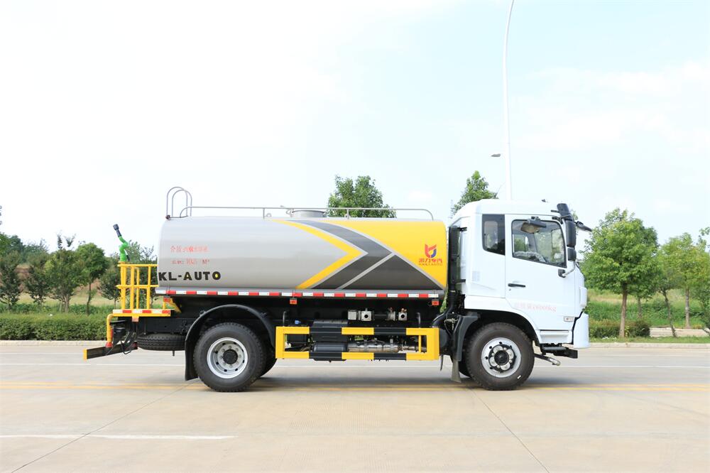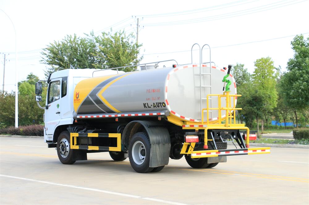灑水車前裝有鴨形噴嘴或圓頭沖嘴,后面裝有圓柱開灑水噴嘴或蓮蓬頭噴嘴,后部有一工作平臺(tái),裝配有水炮。后部還可裝8個(gè)噴嘴(選裝)。